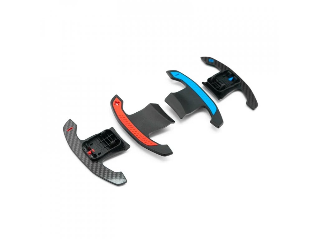 Automatické řadicí páky ve stylu BMW G8X s červenými detaily v lesklém uhlíkovém. Tyto řadicí páky vyrobené z vysoce kvalitních uhlíkových vláken mají červené akcenty a texturovaný modrý podklad. Jako přímá náhrada za tovární položky se tato pádla velmi snadno instalují.