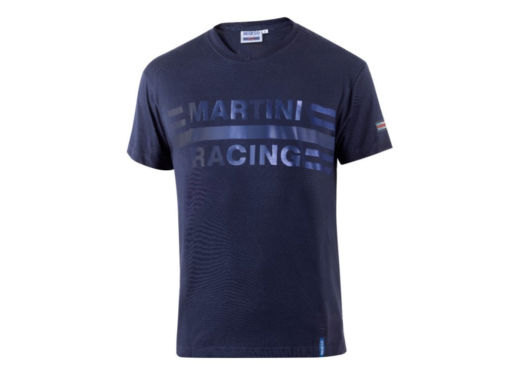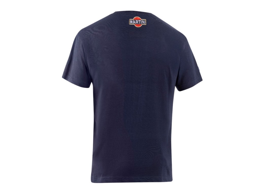 Tmavě modré pánské tričko s velkým, centrálně umístěným ikonickým logem Martini Racing na hrudi.