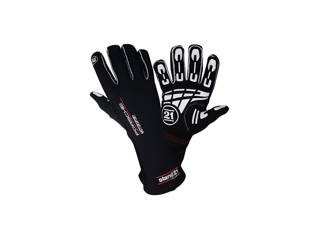 Špičkové závodní rukavice Stand21 s logem Porsche Motorsport. Vnější prošité švy eliminují tlakové body na prstech a dlaních, což vede k výjimečnému pohodlí a vynikajícímu pocitu. Silikonové úchopy na dlaních a prstech s ergonomicky optimalizovanými antivibračními polštářky pomáhají eliminovat puchýře a nepohodlí během dlouhých závodů.